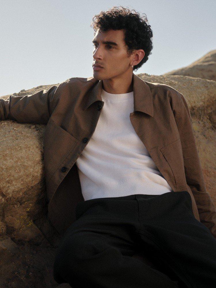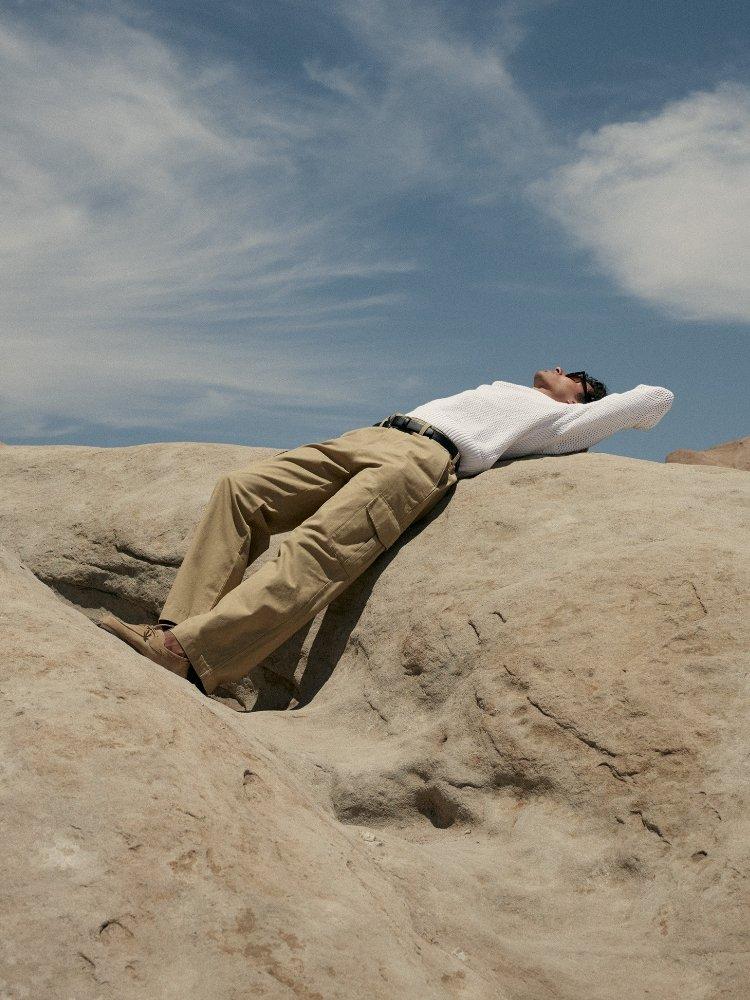 Tones of olive leaf, light agave, mangrove and beachwood extracted from the desert’s epic rock formations and vegetation imbue featherweight sweaters to crochet-knit shirting. Cargo pants and traditional workwear layers have been refined in Italian linen and cotton, as well as a field jacket crafted from supple suede.