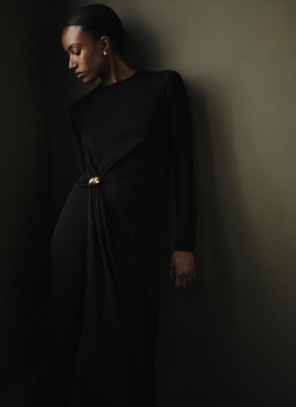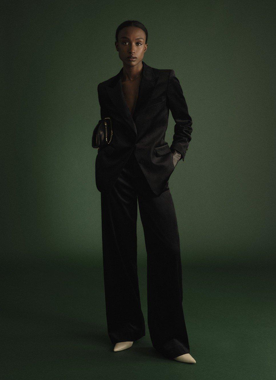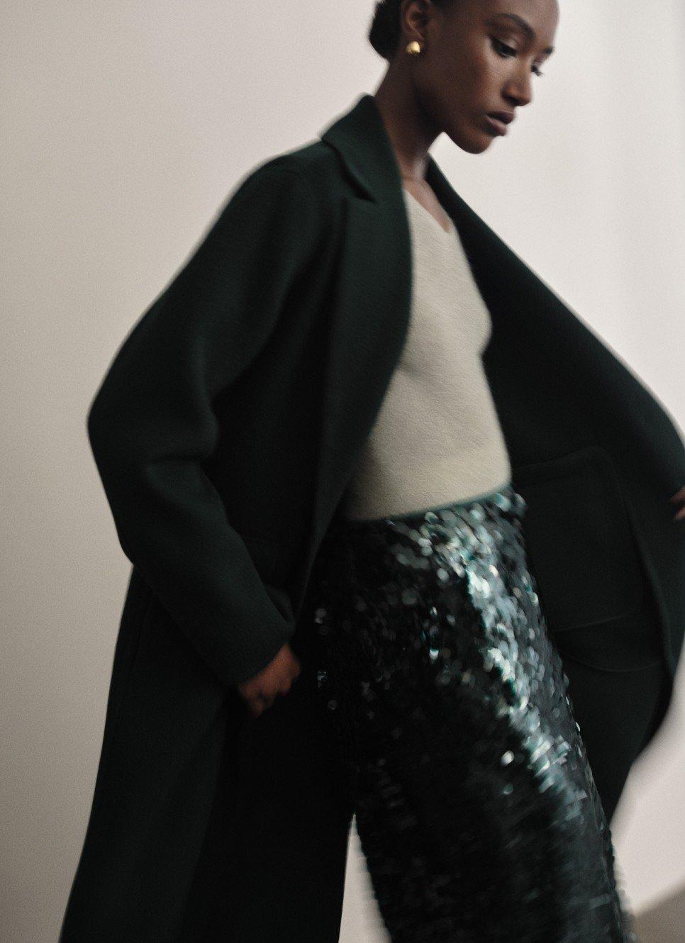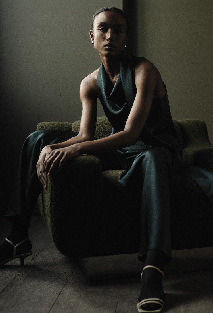 The collection centers around satins and cashmeres, leathers and wools in black, juniper and cream, delivering pieces that are both powerful and personal to a timeless wardrobe. But it’s not all restraint; there are dramatic sequin pieces, frivolous fringed skirts, Lurex sweaters and an unexpected shaggy jacket which brings texture and dimension to the palette. Silhouettes are elongated with a bias-cut satin maxi skirt and matching draped top. A cream three-piece suit has an elongated flare leg, and a long wool knit dress is draped and cinched with a gold metal sculptural broach. Setting a balance between structure and softness are gathered crepe blouses and dresses with delicate details subtly reminiscent of the '70s Biba.