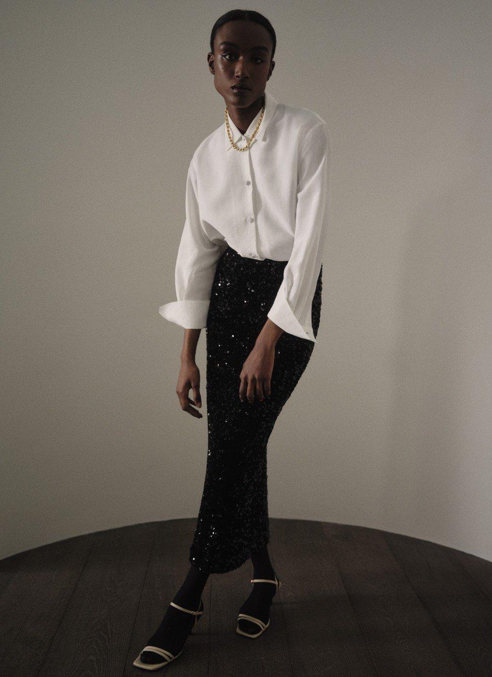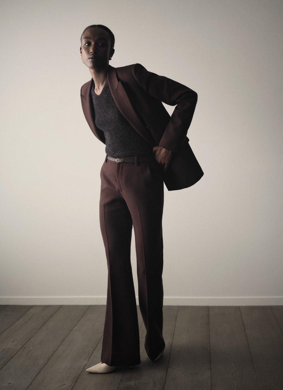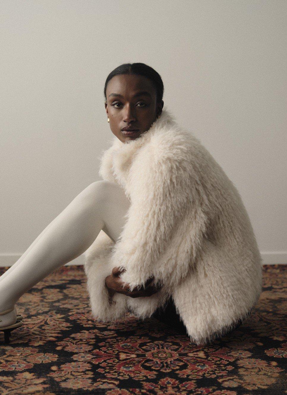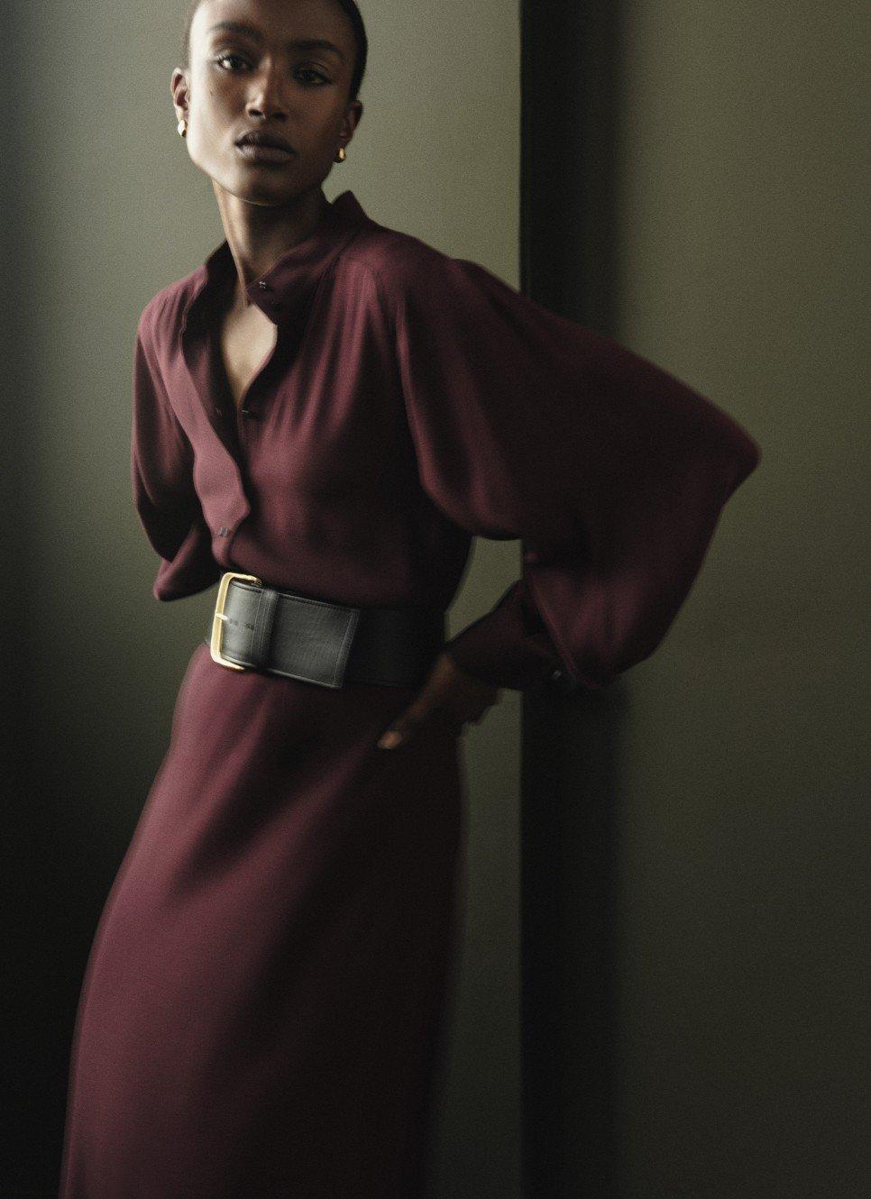 The collection centers around satins and cashmeres, leathers and wools in black, juniper and cream, delivering pieces that are both powerful and personal to a timeless wardrobe. But it’s not all restraint; there are dramatic sequin pieces, frivolous fringed skirts, Lurex sweaters and an unexpected shaggy jacket which brings texture and dimension to the palette. Silhouettes are elongated with a bias-cut satin maxi skirt and matching draped top. A cream three-piece suit has an elongated flare leg, and a long wool knit dress is draped and cinched with a gold metal sculptural broach. Setting a balance between structure and softness are gathered crepe blouses and dresses with delicate details subtly reminiscent of the '70s Biba.
