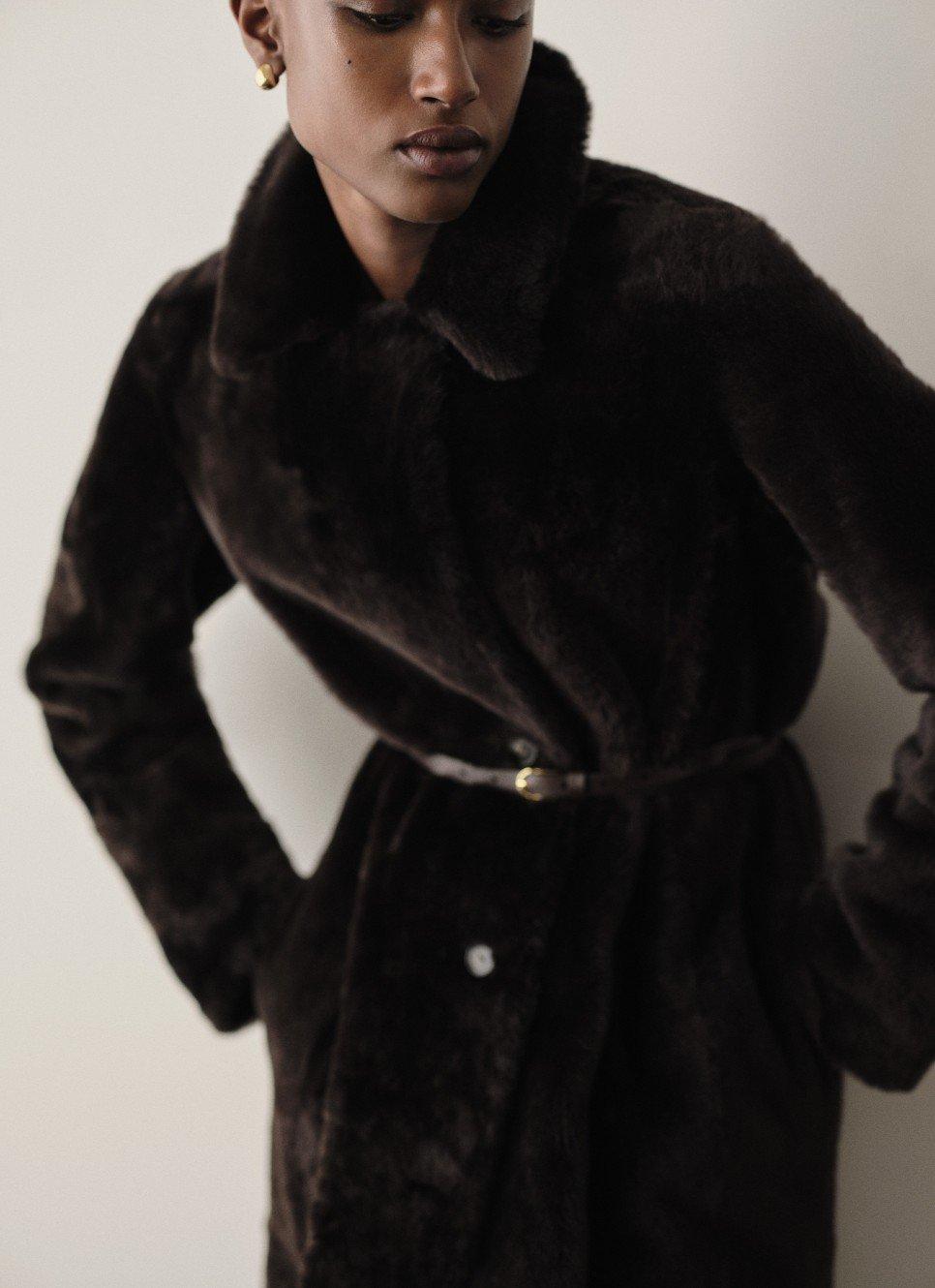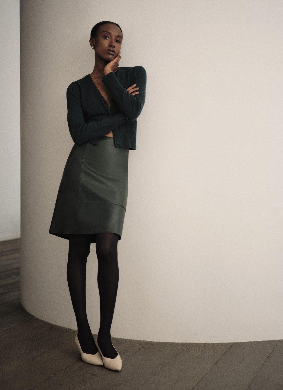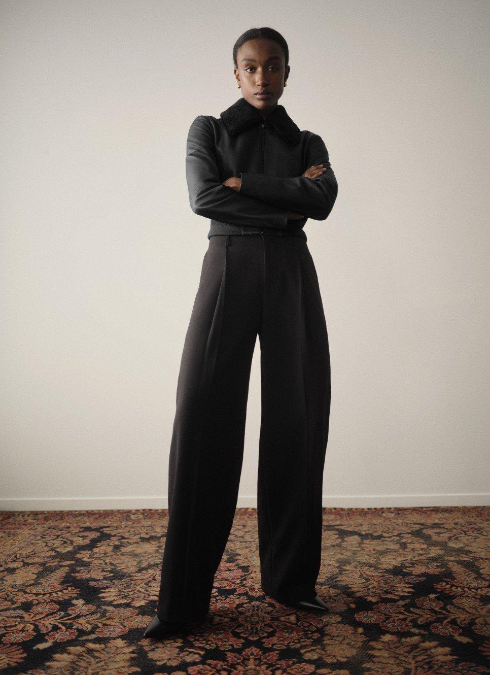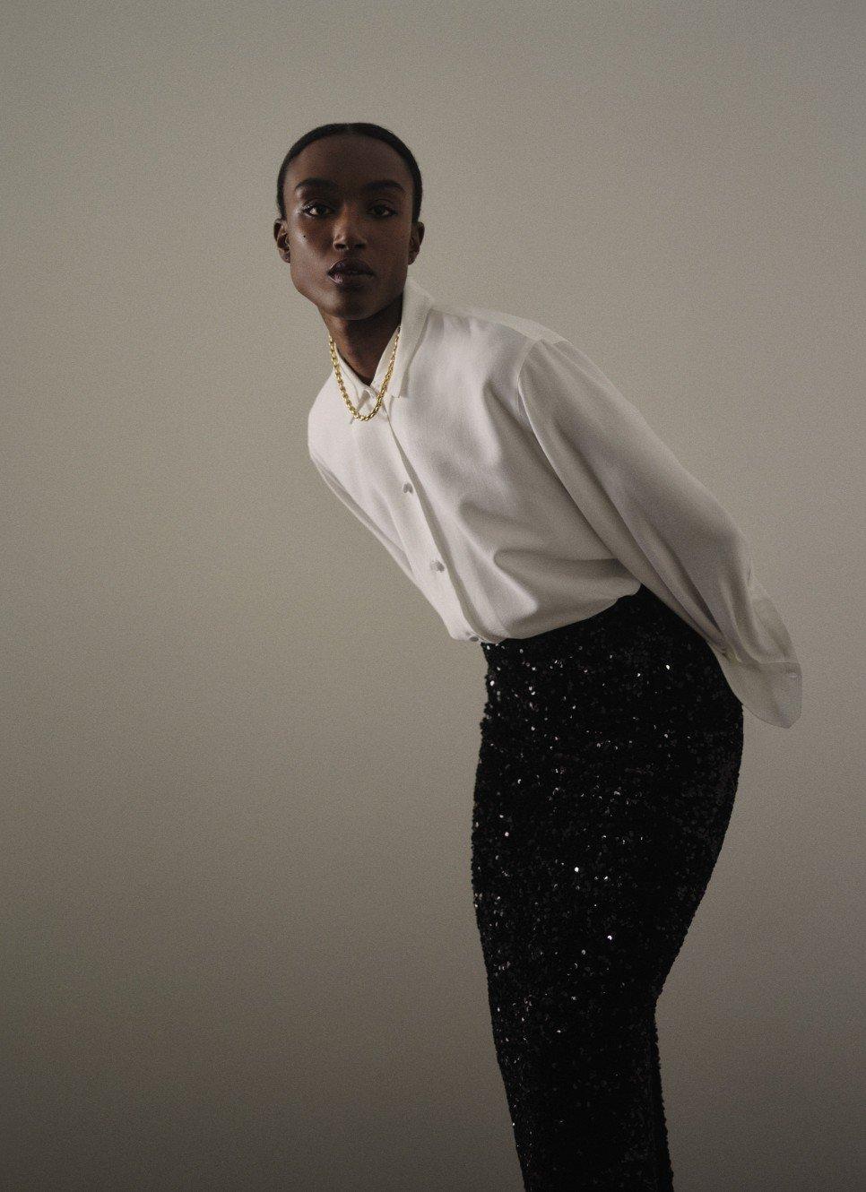 The collection centers around satins and cashmeres, leathers and wools in black, juniper and cream, delivering pieces that are both powerful and personal to a timeless wardrobe. But it’s not all restraint; there are dramatic sequin pieces, frivolous fringed skirts, Lurex sweaters and an unexpected shaggy jacket which brings texture and dimension to the palette. Silhouettes are elongated with a bias-cut satin maxi skirt and matching draped top. A cream three-piece suit has an elongated flare leg, and a long wool knit dress is draped and cinched with a gold metal sculptural broach. Setting a balance between structure and softness are gathered crepe blouses and dresses with delicate details subtly reminiscent of the '70s Biba.